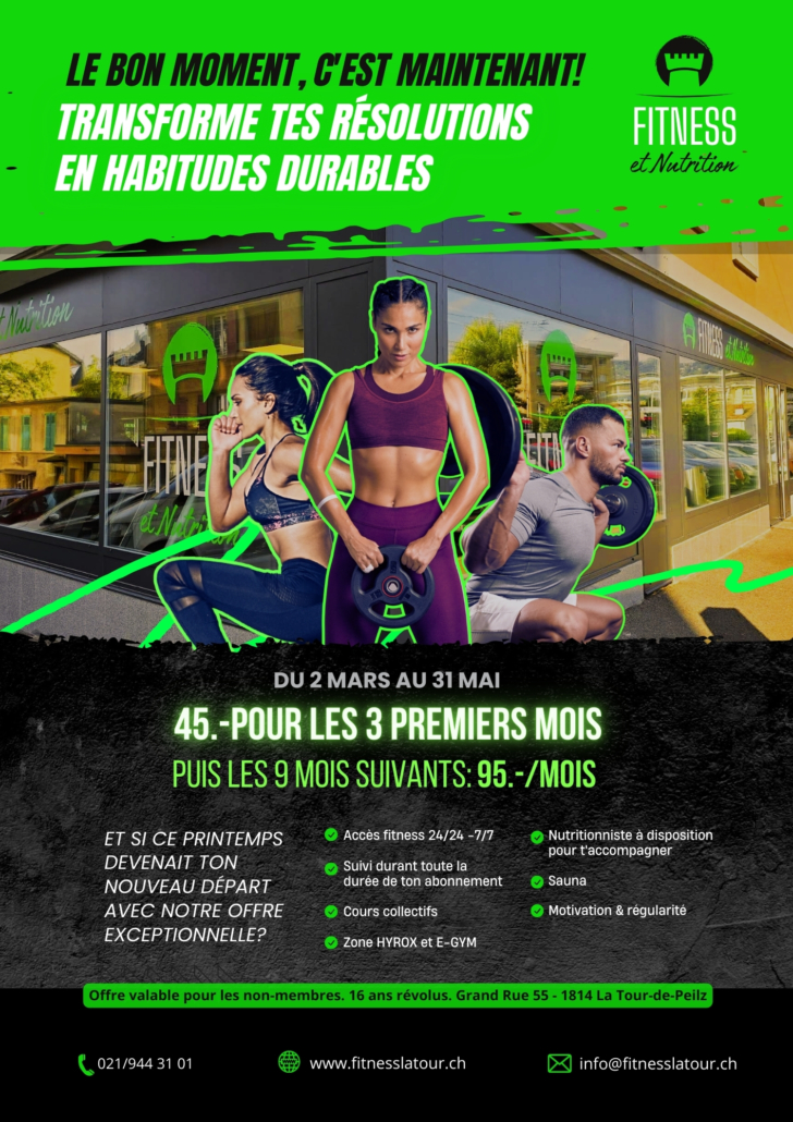 Le Fitness La Tour te propose un cocktail d’énergie, d’ambiance conviviale et de confort en toute simplicité. Formules à partir de CHF 69.—par mois, formalités d’enregistrement non comprises. Essaye une séance découverte dans notre club et adopte une vie saine.
